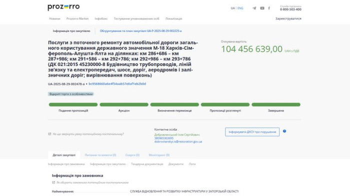 За даними з платформи Prozorro, 29 серпня Служба відновлення та розвитку інфраструктури в Запорізькій області оголосила тендер на послуги з поточного ремонту автомобільної дороги загального користування державного значення М18 Харків-Сімферополь.