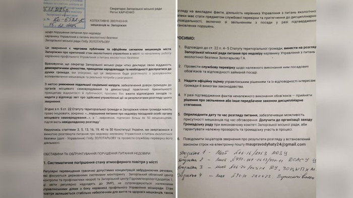 У зверненні активісти попросили винести на розгляд сесії Запорізької міськради недовіру до Гліба Золотарьова як очільника Управління з питань екологічної безпеки, провести службу перевірку щодо виконання ним обов'язків та надати офіційну оцінку його управлінським рішенням.