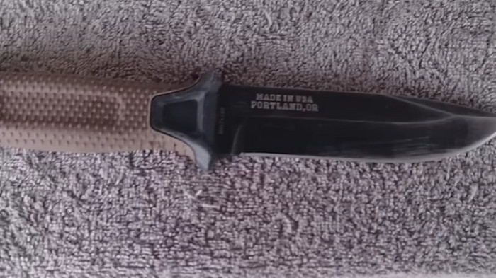 Трофейний ніж, з яким «Жокей» вступив у рукопашний бій з окупантом. Скриншот з відео YouTube/1 ОШП"Чую, росіянин з напарником перекликається. Говорить, що мене завалив вже. Вибору не було, не хотілося загинути так. Ніж трофейний вихватив, піднявся. А він же близько був біля моєї амбразури. Одною рукою за автомат схопив, підтягнув до себе. А другою рукою, завдавав ударів ножем, щоб не здійснив постріл. Я його поборов. Забрав в нього боєкомплект та рацію. Вискочив побратимам допомагати. Інші двоє, що залишилися, відкотилися назад. Бій скінчився", — розповів "Жокей".