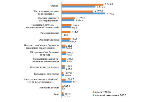 У порівнянні з бюджетом на 2025 рік, у громаді виросли видатки на освіту, медицину та утримання органів місцевого самоврядування. Також зріс розмір резервного фонду. Водночас зменшились видатки на житлово-комунальне господарство, заходи з ліквідації надзвичайних ситуацій, культуру.