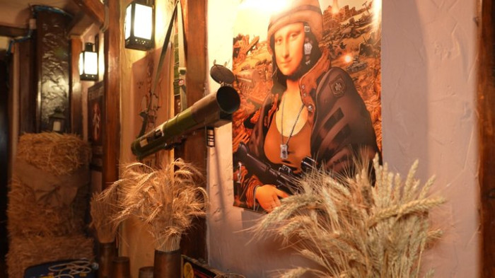 "Це символіка і козацька, і військова. У нас військовим знижка 15% на все меню кухні. Кава безкоштовна. Тому люди приходять і дарують свої шеврони, прапори".