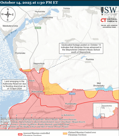 Геолокаційні кадри, опубліковані 14 жовтня, свідчать про те, що українські війська нещодавно просунулися на південь від Степногірська (на захід від Оріхова).