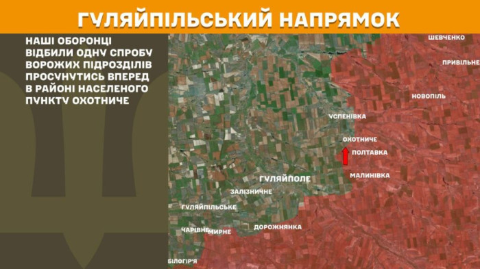 На Гуляйпільському напрямку українські оборонці відбили одну спробу ворожих підрозділів просунутись вперед в районі населеного пункту Охотниче.