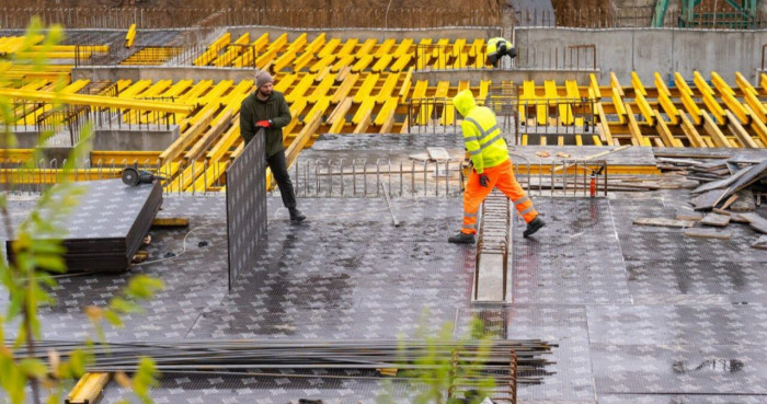 На іншому — вже відбувається бетонування стін, колон та пілонів, паралельно виконується улаштування опалубки плити перекриття.