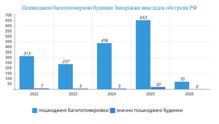 Пошкоджені багатоповерхівки у Запоріжжі. У 2022 році — 313, у 2023 — 237, у 2024 — 436, у 2025 — 653, на початок 2026 року — 70. Суспільне Запоріжжя