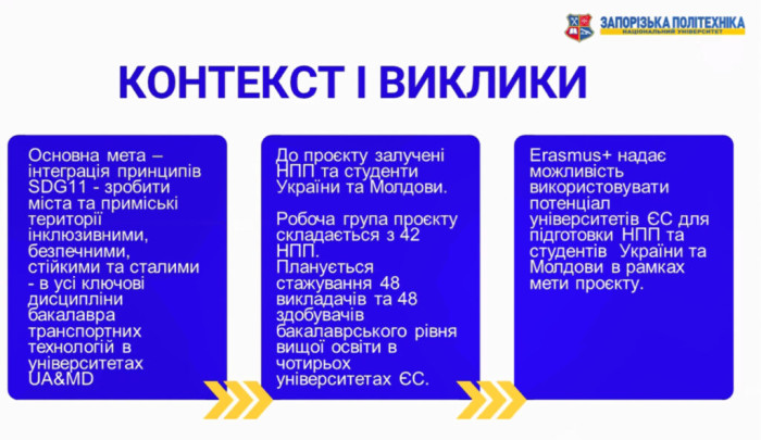 «Організація Об’єднаних Націй визначила 17 глобальних цілей сталого розвитку, яких людство прагне досягти до 2030 року. Серед них одинадцята – зробити міські та приміські території інклюзивними, безпечними, стійкими. Транспортна інфраструктура будь-якого міста чи населеного пункту є запорукою його сталого розвитку. Саме тому цей проєкт спрямований на впровадження елементів цієї глобальної цілі в освітню програму підготовки бакалаврів із транспортних технологій в університетах Молдови та України», – зазначив Сергій Турпак, доктор технічних наук, завідувач кафедри «Транспортні технології» НУ «Запорізька політехніка».
