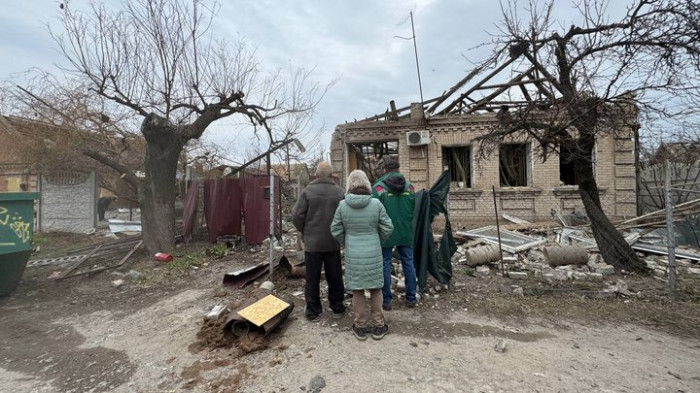 Подружжя Віталія та Елен стоїть на фоні свого зруйнованого будинку. Запоріжжя, 24 березня 2026 року. Суспільне Запоріжжя/Дар’я Пасічник