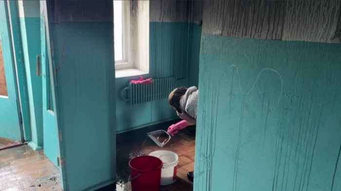Галина прибирає воду після пожежі в покшодженому російським обстрілом будинку. Запоріжжя, 24 березня 2026 року. Суспільне Запоріжжя/Поліна Мороз