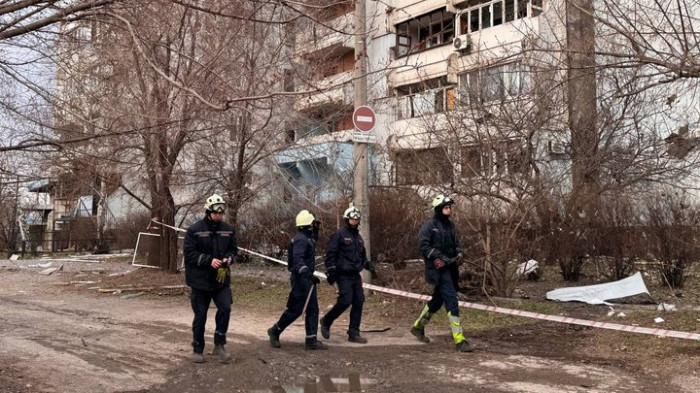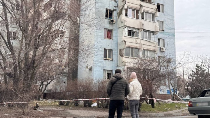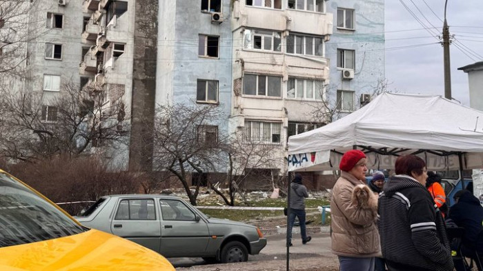 Жителі Запоріжжя дивляться на понівечену російським обстрілом багатоповерхівку в Запоріжжі, 24 березня 2026 року. Суспільне Запоріжжя/Поліна Мороз