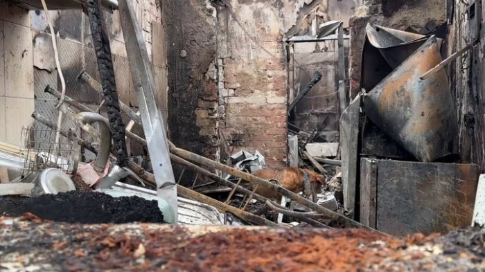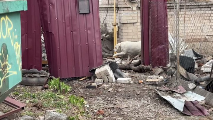 Один із песиків подружжя ходить руїнами будинку. Запоріжжя, 24 березня 2026 року. Суспільне Запоріжжя/Дар’я Пасічник