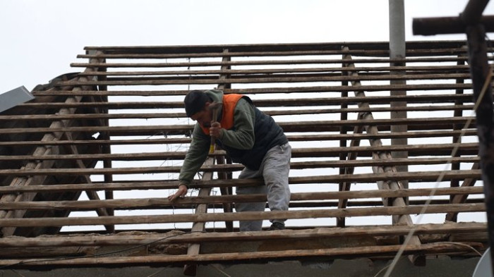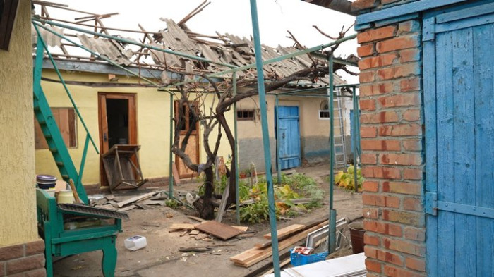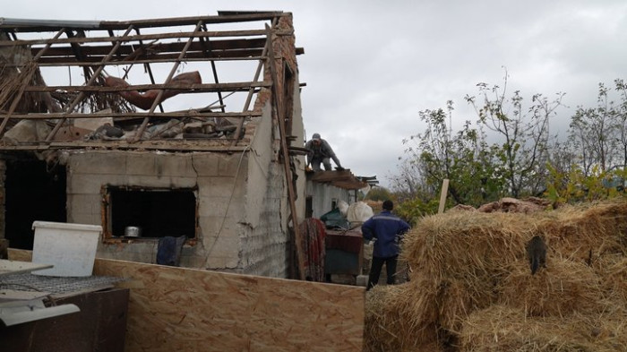 Жителі лагодять дах будинку після обстрілу РФ по Біленькому ввечері 29 жовтня. Суспільне Запоріжжя