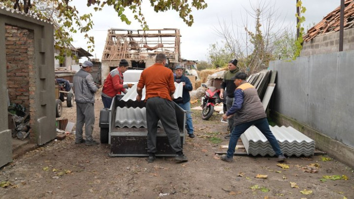 Жителі села допомагають лагодити дах будинку після обстрілу РФ по Біленькому ввечері 29 жовтня. Суспільне Запоріжжя