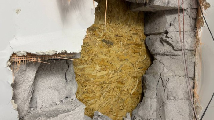 Отвір у стіні будинку внаслідок російського обстрілу. Нині закритий OSB-плитою. Запоріжжя, 16 грудня 2025 року. Суспільне Запоріжжя