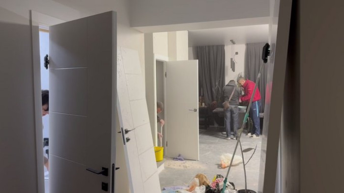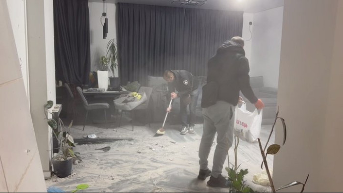 Родина прибирає у пошкодженому будинку в Запоріжжі після російського обстрілу, 16 грудня 2025 року. Суспільне Запоріжжя