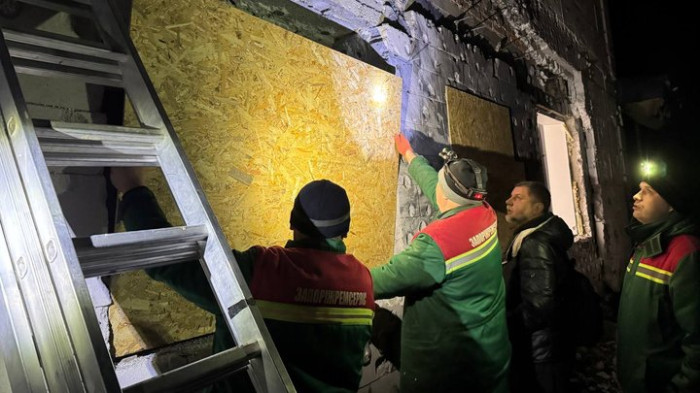 Комунальники закривають OSB-плитами вибиті обстрілом шибки. Запоріжжя, 16 грудня 2025 року. Суспільне Запоріжжя