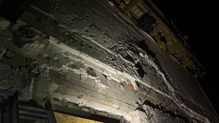 Пил у повітрі від російського обстрілу в пошкодженому будинку. Запоріжжя, 16 грудня 2025 року. Суспільне Запоріжжя