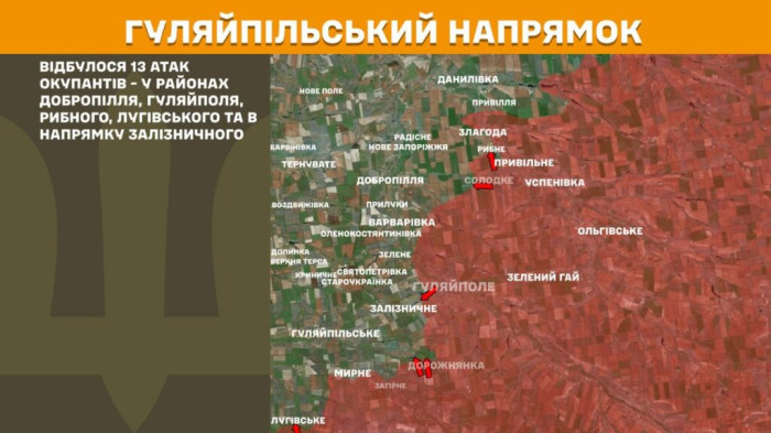 На Гуляйпільському напрямку відбулося 13 атак окупантів у районах Добропілля, Гуляйполя, Рибного, Лугівського та в напрямку Залізничного.