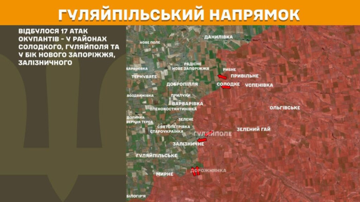 На Гуляйпільському напрямку відбулося 17 атак окупантів за минулу добу у районах Солодкого, Гуляйполя та у бік Нового Запоріжжя, Залізничного.