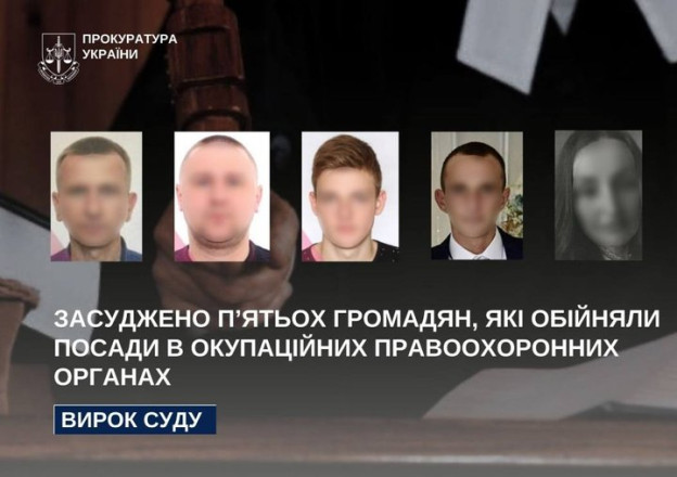 - до 14 років ув'язнення — чоловіку з Енергодара та жінці з Приморська, котрі добровільно обійняли посади дільничного уповноваженого поліції в так званому "отделе полиции № 1 (г. Энергодар) Управления внутренних дел по г. Васильевка и Васильевскому району" та слідчого в незаконно створеному "Приморском отделе полиции управления внутренних дел по г. Бердянску и Бердянскому району Запорожской области".