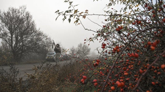 Поліцейський направляє гвинтівку під час загрози російського FPV-дрона, прямуючи евакуювати цивільних з прифронтового міста Гуляйполе, Запорізька область, Україна, 14 листопада 2025 року. REUTERS/Stringer