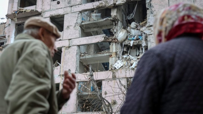 Мешканці стоять біля житлового будинку, ураженого під час російського військового удару у прифронтовому місті Гуляйполе в Запорізькій області. 11 листопада 2025 року. REUTERS/Sergiy Chalyi