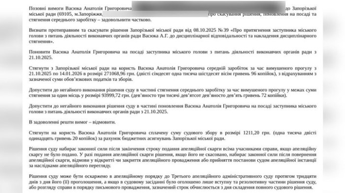 Суд постановив поновити Анатолія Васюка на посаді заступника міського голови з питань діяльності виконавчих органів влади з 21 жовтня 2025 року та виплатити йому заробітну платню у розмірі 271 068, 96 гривень за час вимушеного прогулу.