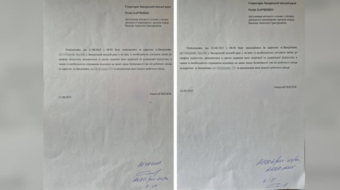 Повідомлення Анатолія Васюка про перебування його в робочий час у приміщенні ЗМР 21 та 22 серпня 2025 року, зареєстроване у канцелярії міськради. Facebook/ Анатолій Васюк