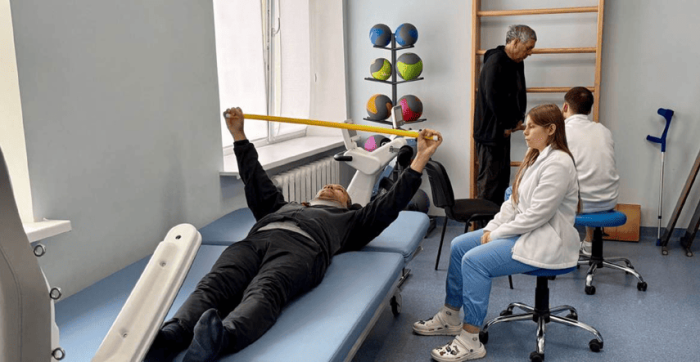 У відділенні є різні обладнані для реабілітації зали. Наприклад, у залі кінезіотерапії фахівці допомагають пацієнтам відновлюватися через фізичні вправи, а в деяких випадках — навчають людей наново ходити, сідати, переступати через бар’єри.