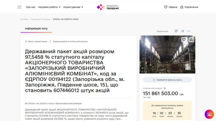 Фонд державного майна (ФДМУ) вкотре виставив на продаж державний пакет акцій, що становить 97,5% капіталу акціонерного товариства "Запорізький виробничий алюмінієвий комбінат" (ЗАлК). Попередні спроби приватизувати підприємство були скасовані через відсутність пропозицій.