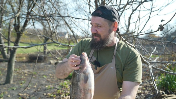 «Східняк» тримає коропа для борщу, листопад 2025 року. Суспільне Запоріжжя"Лимонний сік додаємо, щоб прибрати річковий запах. Воно, звісно, повністю не прибере, але точно допоможе."