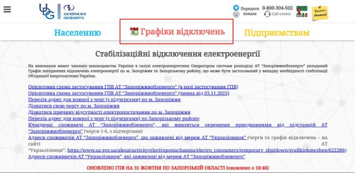 Для того, щоб користувачі могли легше знайти інформацію, на офіційному сайті "Запоріжжяобленерго" додати окрему сторінку "Графіки відключень": там є дані про переліки черг та актуальні графіки знеструмлень: