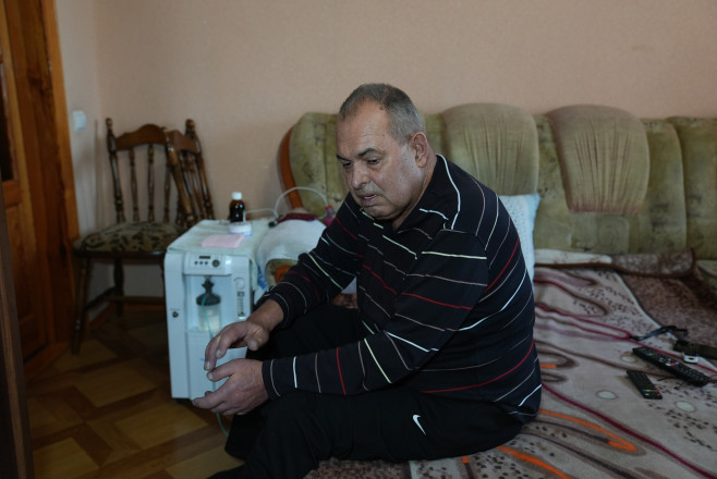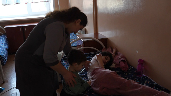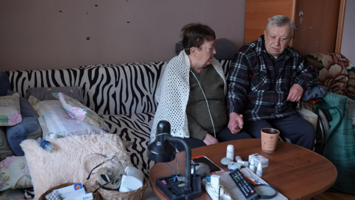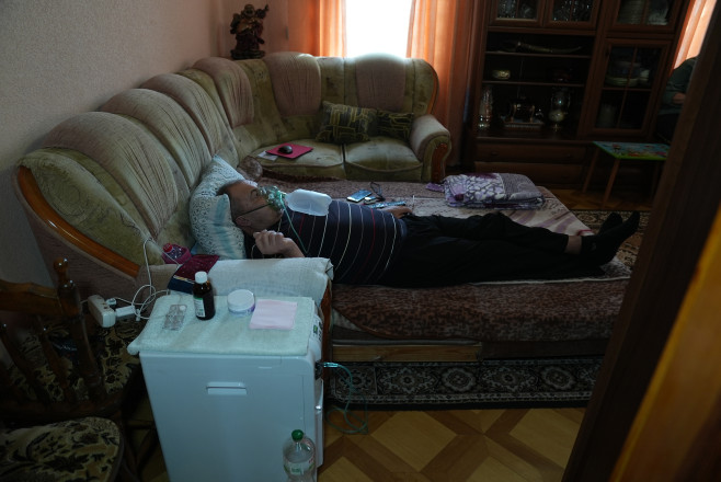 Поруч із кисневим концентратором облаштувала своє спальне місце 67-річна Ірина Хлєбнікова. У неї діагностували хронічне обструктивне захворювання легень: