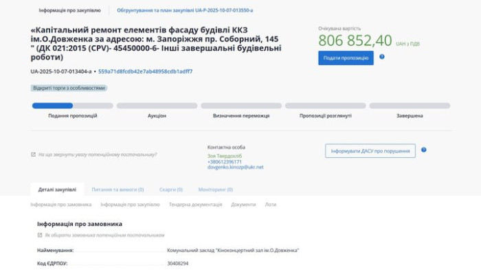 Тендер на ремонт фасаду кінотеатру Довженка в Запоріжжі. Платформа публічних закупівель «Prozorro»