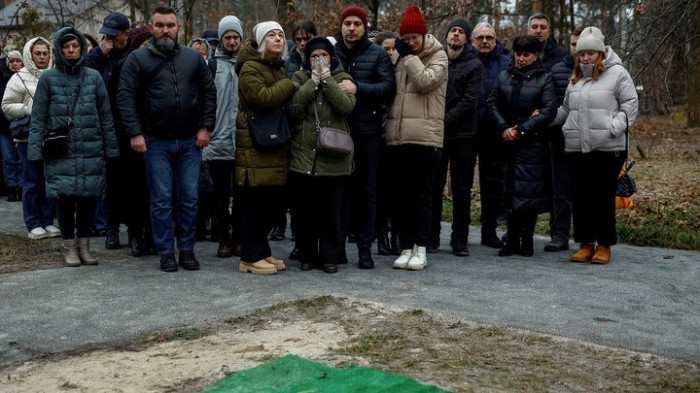 Родичі та друзі на похороні мера тимчасово окупованого міста Дніпрорудне Запорізької області Євгена Матвєєва. Міського голову викрали росіяни понад два роки тому. Його тіло повернули в Україну під час останнього обміну полоненими і тілами загиблих. Матвєєва поховали в Бучі на Київщині, 5 грудня 2024 року. REUTERS/Alina Smutko