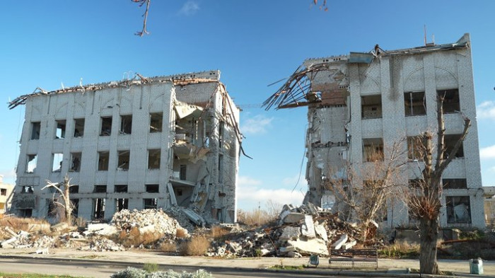 Зруйнована російськими обстрілами будівля у прифронтовому Оріхові на Запоріжжі, 25 листопада 2025 року. Максим Савчук/Суспільне Запоріжжя