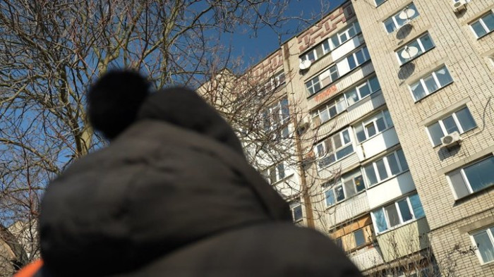 Дар’я Скидан на фоні багатоповерхівки, де родина жила у момент російського обстрілу восени 2024 року. Суспільне Запоріжжя