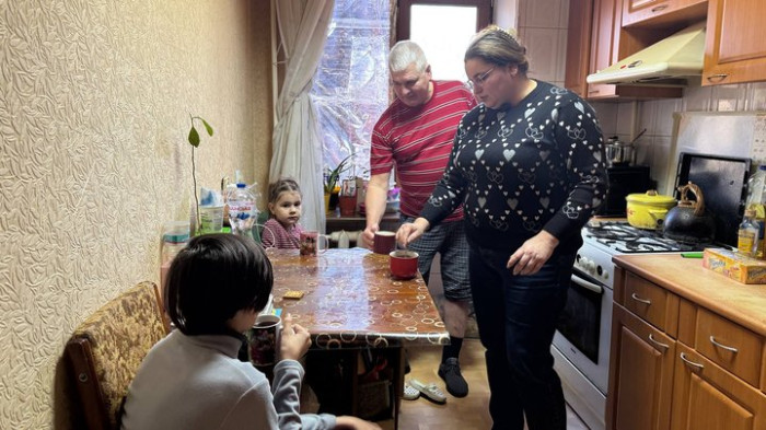 Родина Скидан разом п’є чай у новій квартирі, де знайшли прихисток після обстрілу восени 2024 року. Суспільне Запоріжжя