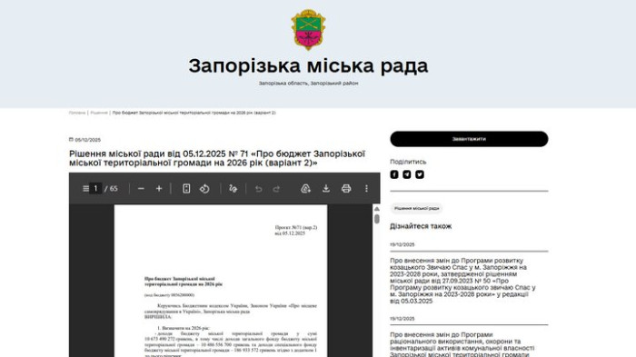 17 грудня, на 34-й сесії Запорізької міської ради, депутати ухвалили бюджет міської територіальної громади на 2026 рік. Можновладці проголосували за проєкт від 05.12.2025 № 71 (варіант 2). Чинна версія рішення, станом на 21 грудня, ще не опублікована на сайті ради.