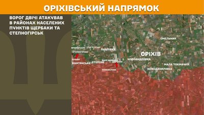 А на Оріхівському напрямку росіяни двічі намагалися просунутися в районах населених пунктів Щербаки та Степногірськ.