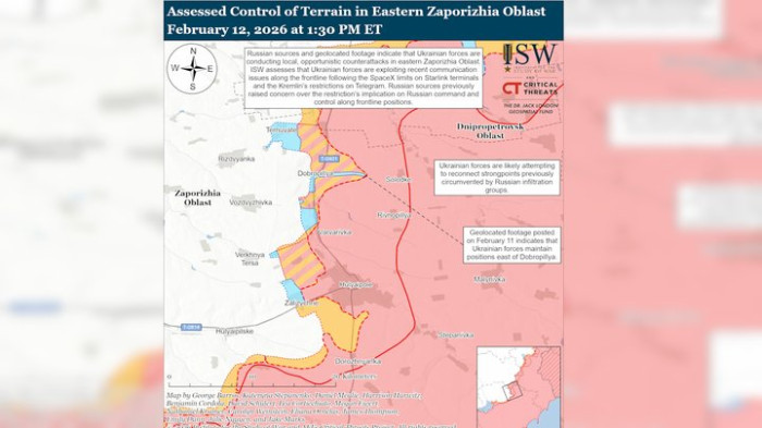 Карта бойових дій, кордони Запорізької та Дніпропетровської областей, 12 лютого 2026. Інститут вивчення війни (ISW)