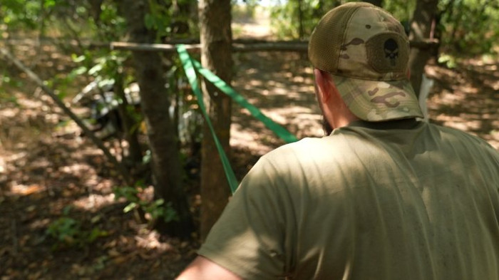 Розрахунок українського розвідувального безпілотника знаходиться на передовій кілька діб, допоки їх не змінять. Увесь цей час поряд з ними перебуває "Цікавий", тож чоловік вирішив обладнати спортивний майданчик прямо на позиціях.