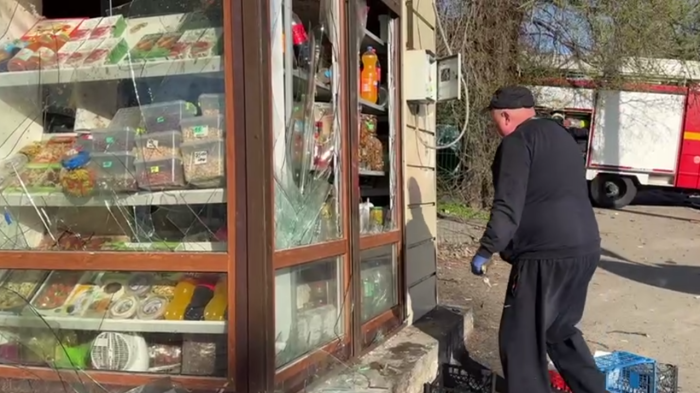 Власник пошкодженого кіоску Олег намагається підрахувати збитки та прибрати уламки скла: