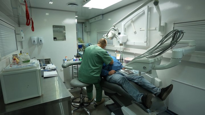 Стоматолог працює в пересувному кабінеті. Суспільне Запоріжжя"Дуже багато людей потребує стоматологічної допомоги. На жаль, у нашого населення стан зубів майже катастрофічний в багатьох. Навіть молоді хлопці є в такому стані, що обійняти і плакати, але ми намагаємося допомагати".