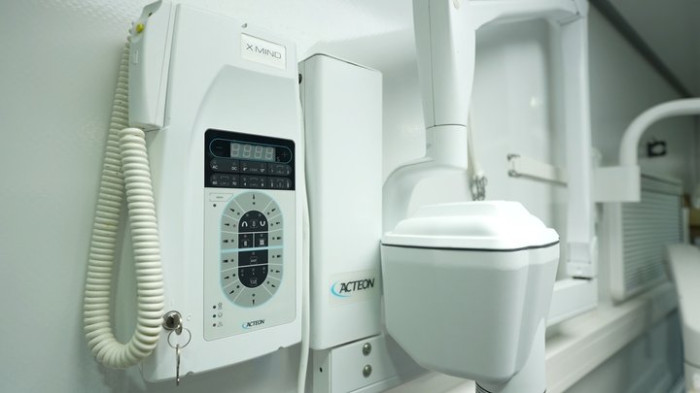 "В нас є все необхідне для надання терапевтичної та хірургічної допомоги. Тобто в нас є рентген установка з радіовізіографомвисокочутливий датчик, що працює в комплексі з рентгенапаратом і монітором, що перетворює іонізуючі промені у цифрове зображення, автоклавобладнання для стерилізації інструментів парою під тиском, дистилятор, Лазер використовується для лікування карієсу, захворювань ясен, пульпіту та інших проблем, а також для відбілювання зубів та хірургічних операційнавіть є. Можна перед пародонтологію профілактика, діагностика та лікування захворювань тканин, які оточують зубвикористовувати, іноді використовуємо для лікування захворювань ясен".