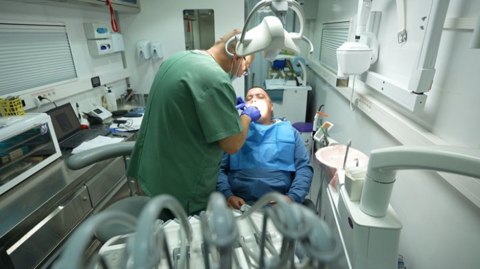Стоматолог працює в пересувному кабінеті. Суспільне Запоріжжя"Ми намагаємося полікувати все, що потрібно лікувати та повидаляти все, що потрібно видаляти. Якщо в людини гострий біль, то її можуть привезти й серед ночі. Це вже ясно, що йде без черги".