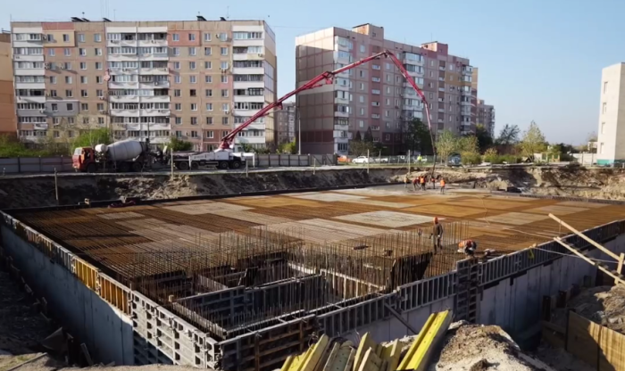 Зранку підрядники безперервно протягом 12 годин заливають верхню плиту — суцільний шар бетону на даху монолітної конструкції.