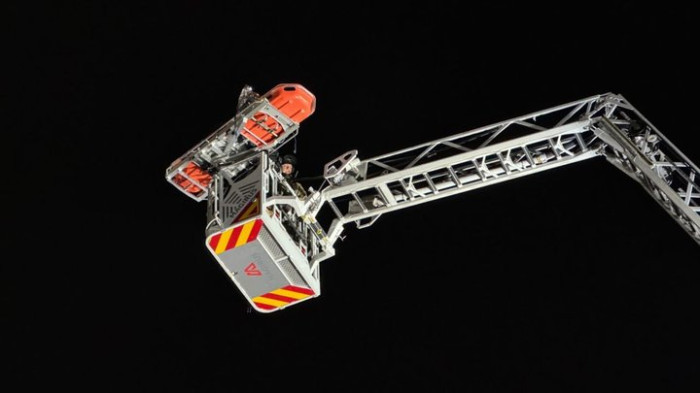 Кран рятувальників, яким вони спускали людей з верхніх поверхів пошкодженої будівлі у Запоріжжі. Наслідки російського обстрілу, 10 грудня 2024 року. ГУ ДСНС України в Запорізькій області