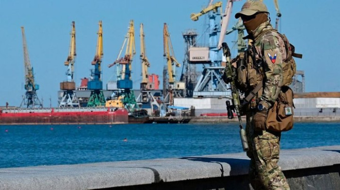 Російський військовий на фоні Бердянського морського торгівельного порту в тимчасово окупованому Бердянську Запорізької області. Бердянська МВА