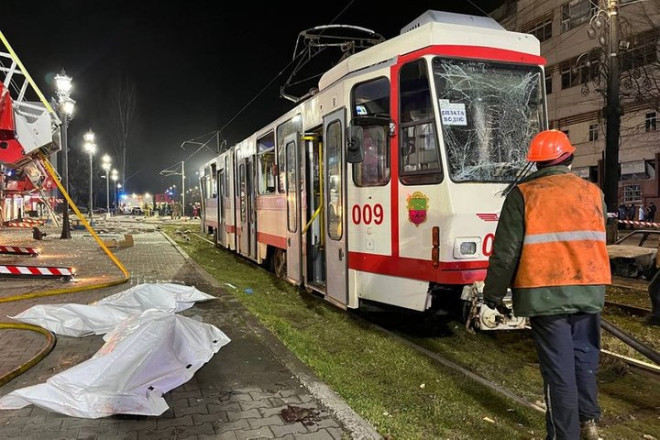 Пошкоджений трамвай на зупинці поблизу місця російського обстрілу. Суспільне Запоріжжя