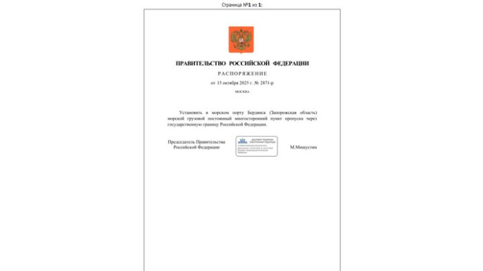 "Встановити в морському порту Бердянськ (Запорізька область) морський вантажний постійний багатосторонній пункт пропуску через державний кордон Російської Федерації", — зазначено в документі російської влади.